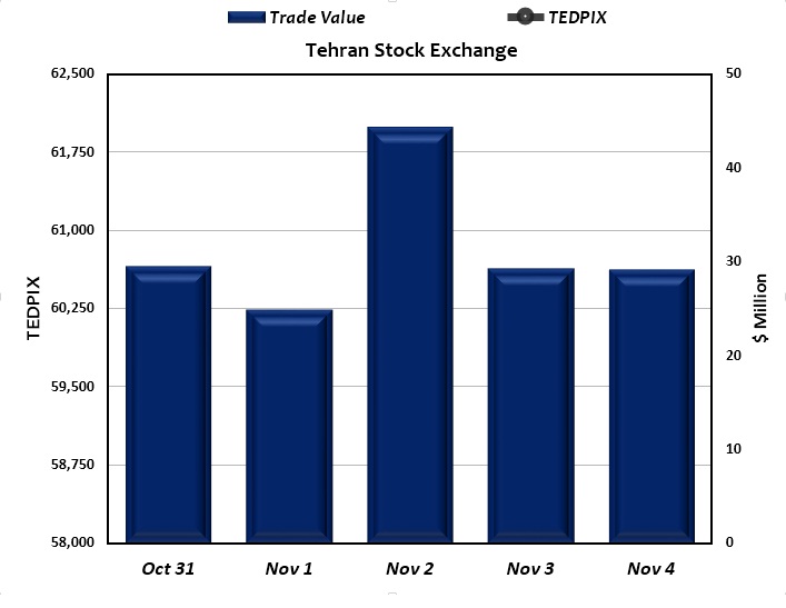 Tehran Stock Exchange’s benchmark inched up 4 points or 0.01% during the week that ended November 4 compared to the previous trading week to settle at 62,927.