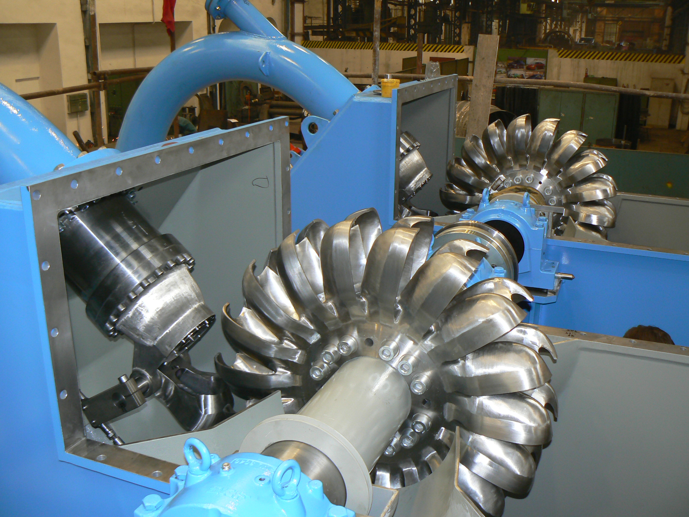Francis turbines are the most common water turbine in use today. They operate in a water head from 40 to 600 meters and are primarily used for electrical power production.