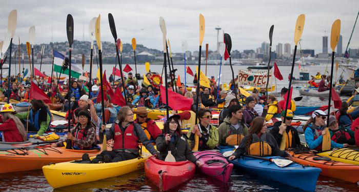 Several so-called "kayaktivist" demonstrations, activists paddling in kayaks and small boats, saw hundreds of participants protest Shell as its rig left the Seattle Harbor for the Arctic.